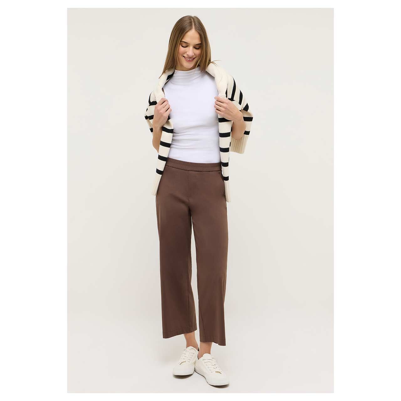 Wie ein Kaffee am Morgen! Die Die Angels Linn Jump bringt Ruhe und Stil in Ihren Look. Die 7/8-Länge und feine Bundfalten sorgen für eine tolle Silhouette mit angenehmem Sitz. Die weiche Baumwollqualität trägt sich besonders komfortabel und macht das Modell zum zuverlässigen Begleiter im Alltag.
