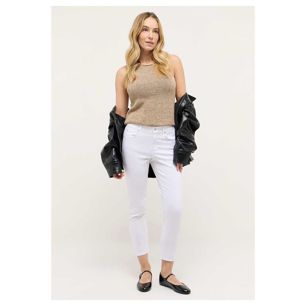 In einem reinen Weiß und mit einem verkürzten Bein in 7/8-Länge punktet die Angels Ornella! Das macht sie zu einer idealen Damenjeans für heiße Tage. Das simple Design wird mit gleichfarbigen Nähten und einem leichten Material ergänzt.
