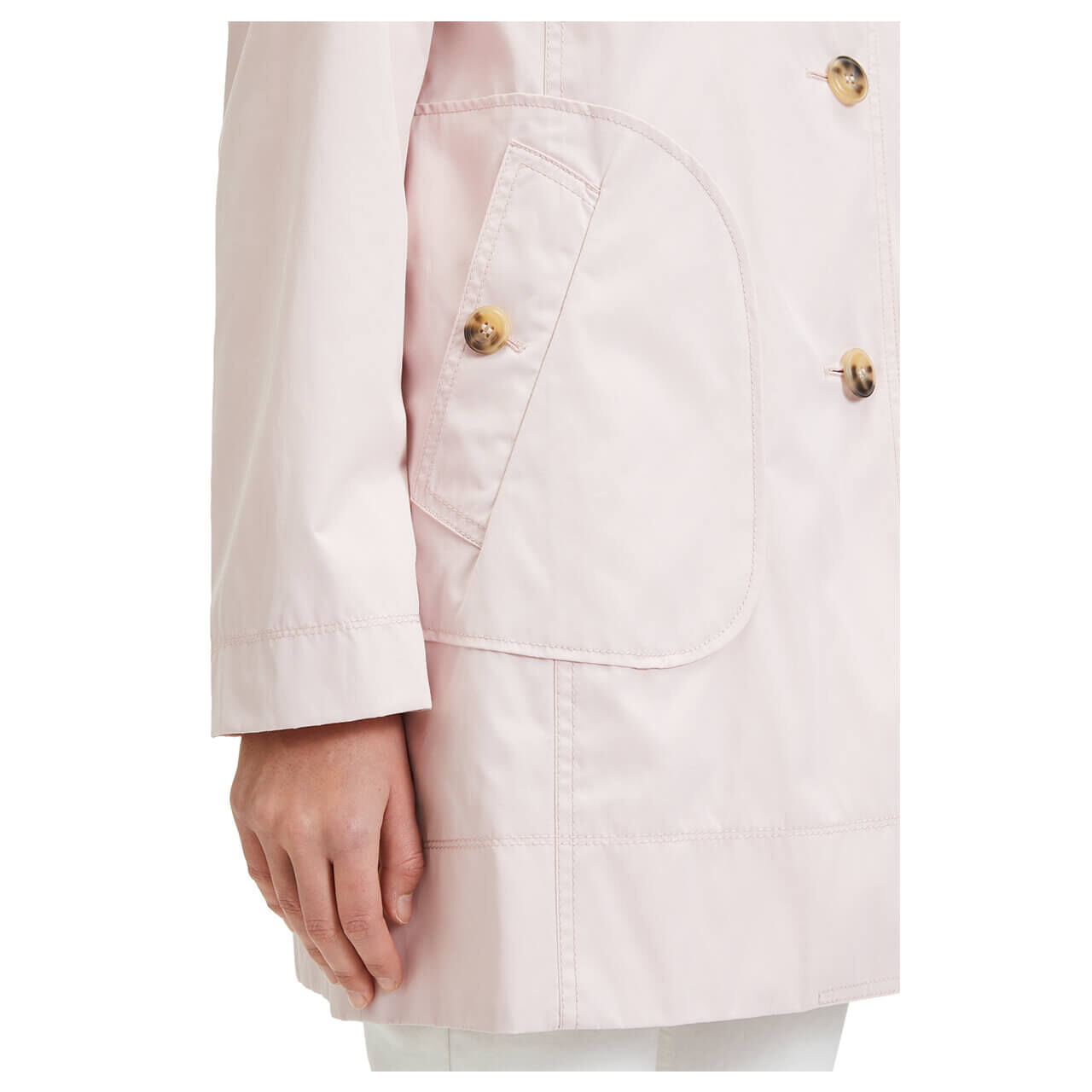 Die Betty Barclay Damenjacke punktet mit ihrem geringen Gewicht und der zarten Pastellfarbe. Außerdem bietet der Trenchcoat zwei Hüfftaschen, die Ihnen Platz für Ihre Utensilien geben.