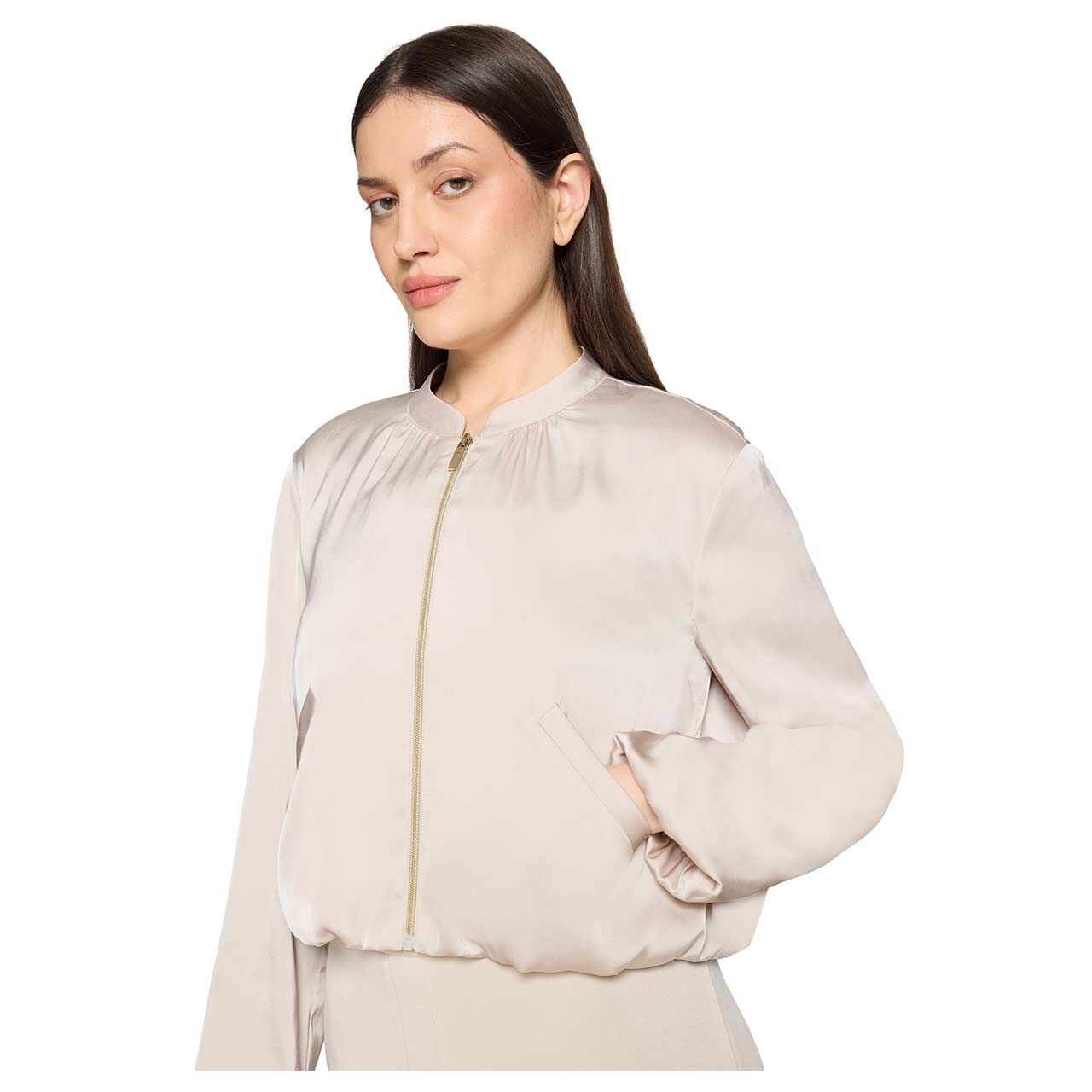 Wie Seide! Die Betty Barclay Damenjacke bringt mit ihrem glänzenden, hellen Beige modernen Chic in Ihren Kleiderschrank. Der gelbgoldene Reißverschluss verstärkt den glamourösen Effekt, während die elastischen Bündchen und die Hüfttaschen der Jacke einen sportlichen Touch auf den Weg geben.