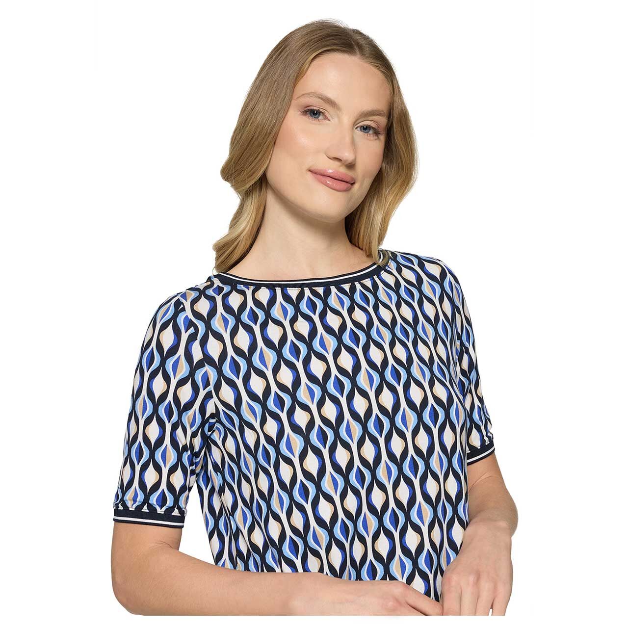 Mit einem kettenähnlichen Muster sorgt dieses Betty Barclay Damen T-Shirt für einen abwechslungsreichen Look. Das stretchige, fließende Material schmiegt sich an Ihre Figur an, während der U-Boot-Ausschnitt eine nette Abwechslung zum standardisierten Rundhals bietet. Die farblich abgesetzten Säume an Hals und Armen bringen einen Hauch Collegestil ein.