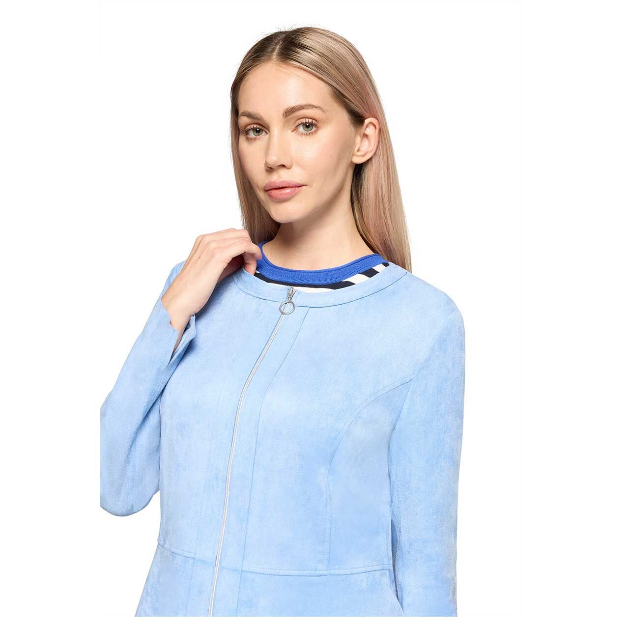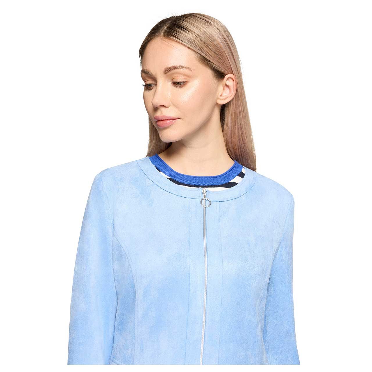 Zartes Hellblau verleiht dieser Betty Barclay Damenjacke eine frische, elegante Ausstrahlung. Das weiche Veloursmaterial fühlt sich angenehm auf der Haut an und sorgt für ein komfortables Tragegefühl im Alltag. Der silberfarbene Reißverschluss setzt einen tollen Akzent und bringt einen schönen Kontrast zur sanften Farbgebung.