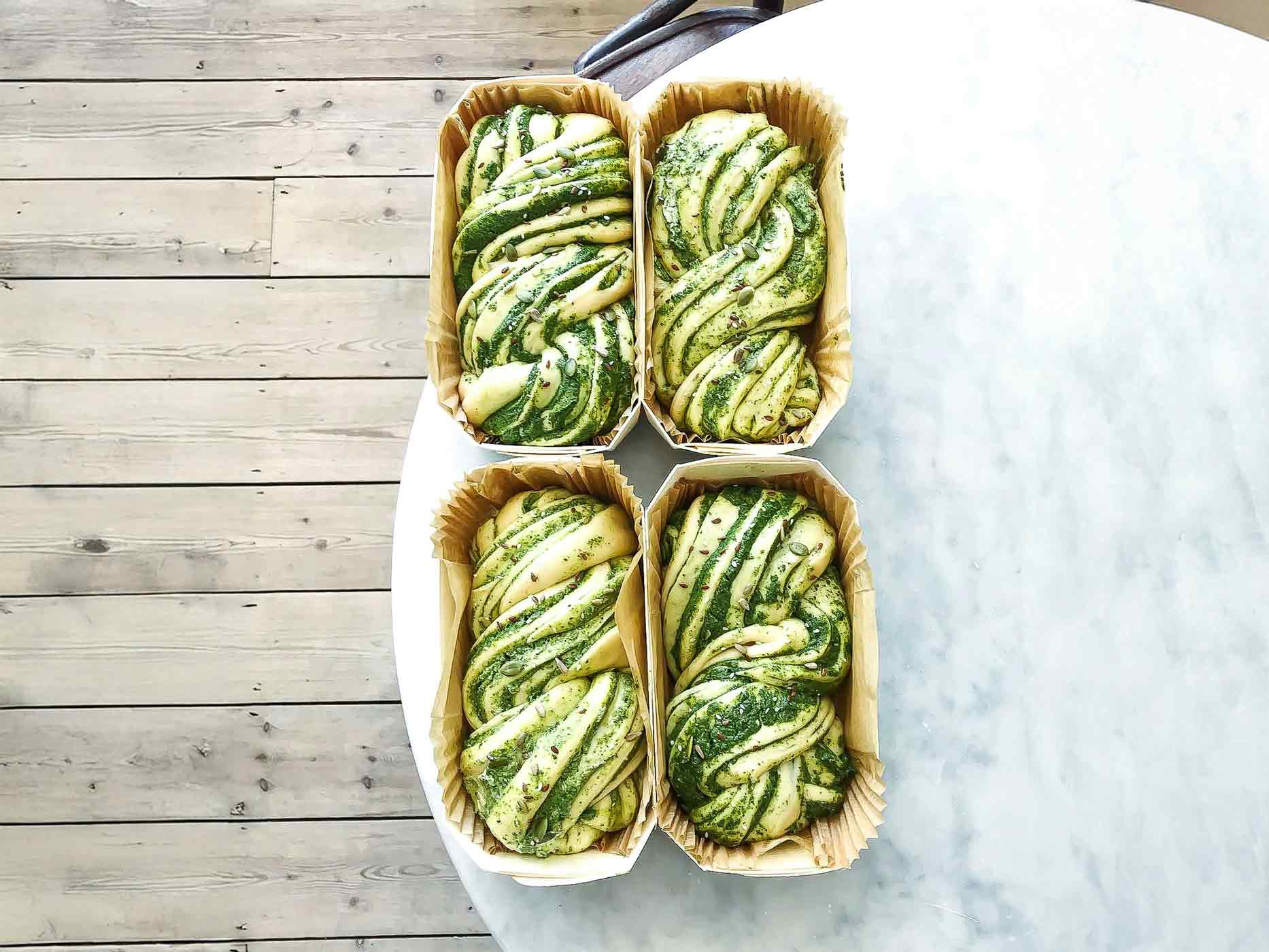 Anschließend schneidest du die Rolle längs auf, damit du zwei gleich lange Stränge bekommst. Die verdrehst du so miteinander, dass das Pesto oben ist. Den Zopf kannst du nun auf einem Backblech oder in einer Kastenform 40 Minuten abgedeckt gehen lassen, bevor du ihn mit einem verquirltem Ei bestreichst. Bei 200°C Ober-/Unterhitze braucht dein Pestozopf etwa 35 Minuten im Ofen.