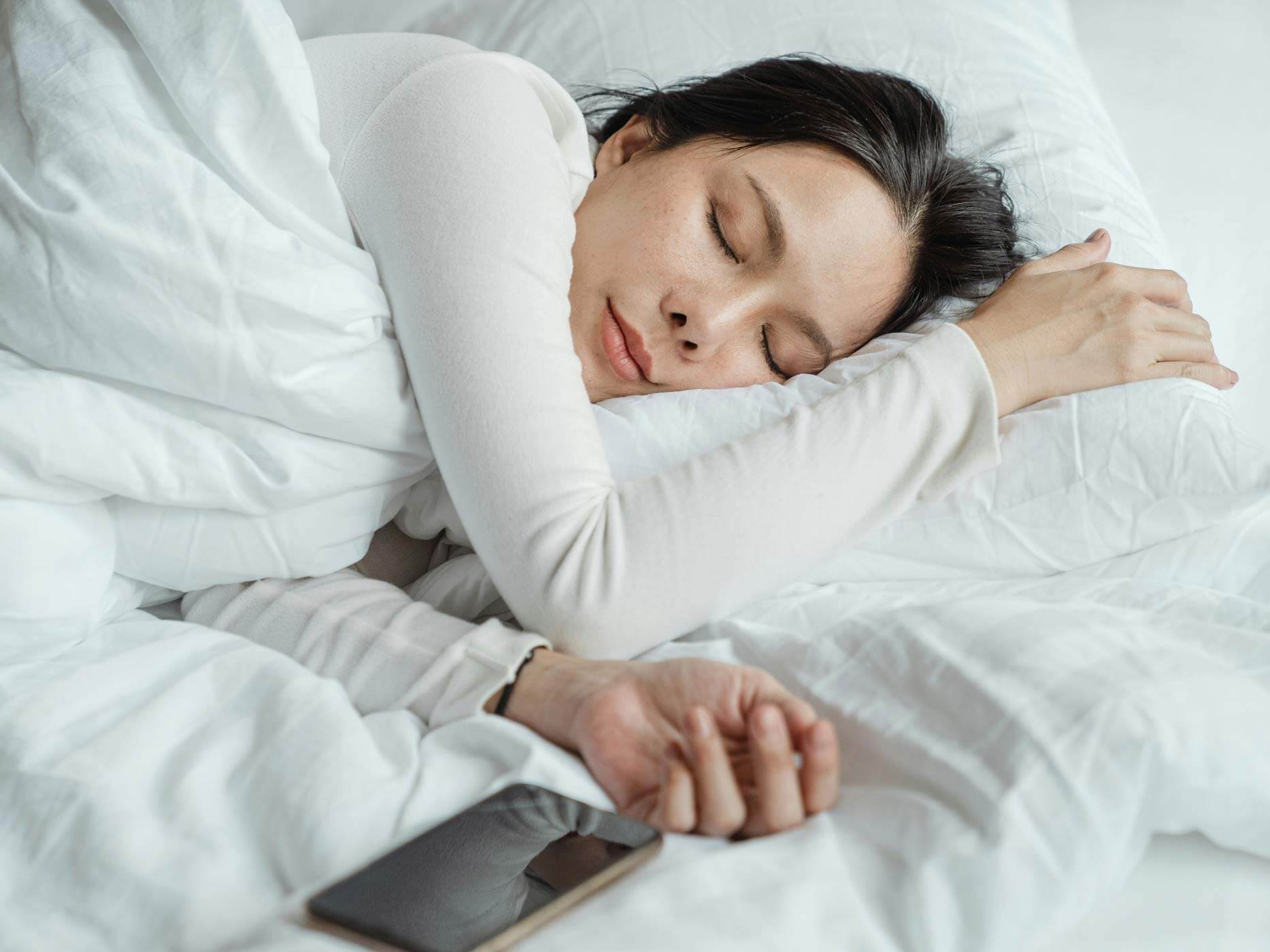 Eine Frau schläft in ihrem Bett, neben ihrer Hand liegt ein Handy.