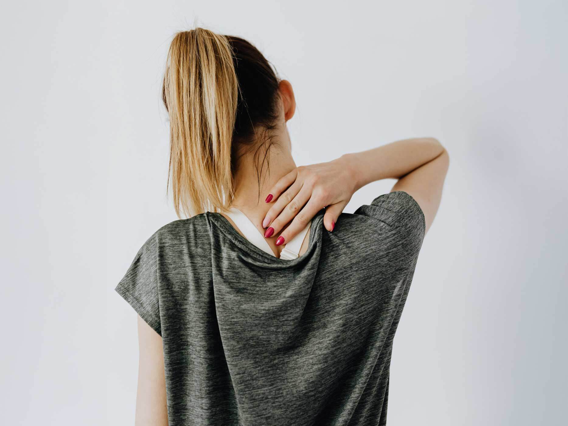 Der Oberkörper einer Frau von hinten, die sich den getapten Nacken reibt.