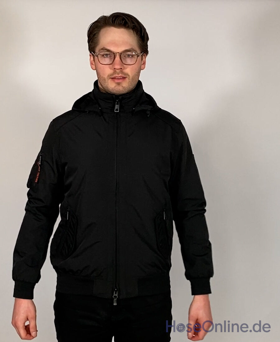 Sehr lässig, die Wellensteyn Cicero: Die schwarze Übergangsjacke ist im Stil einer Bomberjacke designt! Das beweisen der kürzere Schnitt, die Stretchbündchen an Hüfte und Handgelenk sowie die kleine Tasche mit Zipper am Arm. Apropos Taschen: Auf der Außenseite haben Sie davon vier weitere, auf der Innenseite gibt es eine Pocket mit Reißverschluss. Die wind- und wasserdichte Funktionsjacke mit verschweißten Nähten hat eine abnehmbare, größenverstellbare Kapuze, die Sie zusätzlich schützt. Genauso wie der doppelte Stehkragen! Das Obermaterial StroBoAirTec hat eine matte, leicht strukturierte Oberfläche.