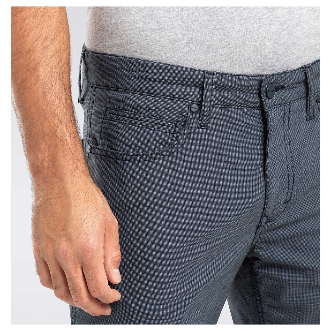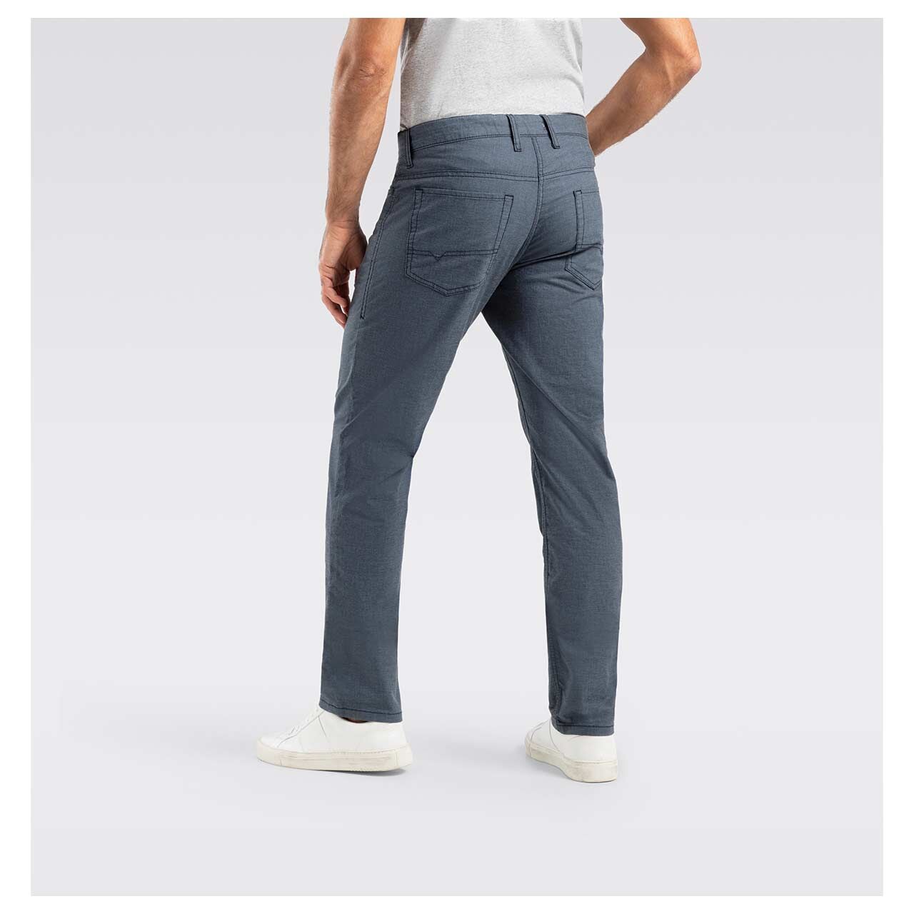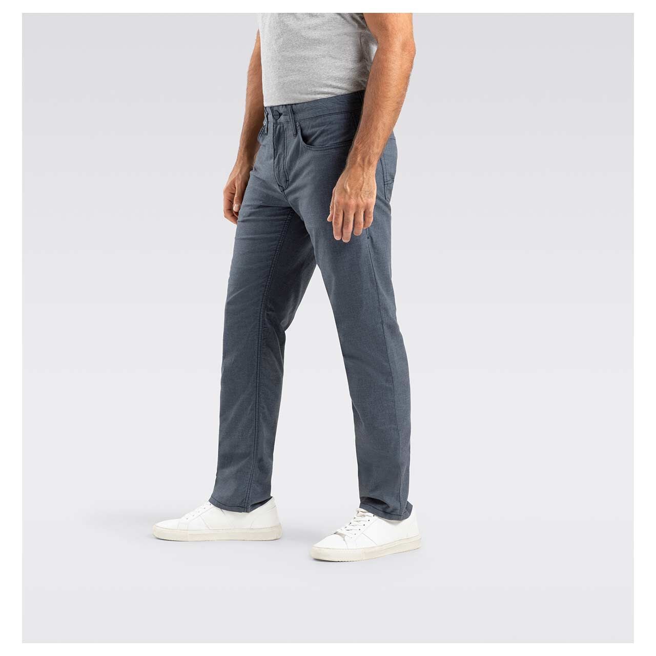 Strukturierte Optik, aber glatter Griff: Die MAC Arne erzeugt mit ihrer Webtechnik einen changierenden Farbeffekt, der eleganz und zurückhaltend wirkt. Die rote Niete der leichten Herrenhose drängt sich dagegen optisch in den Vordergrund!