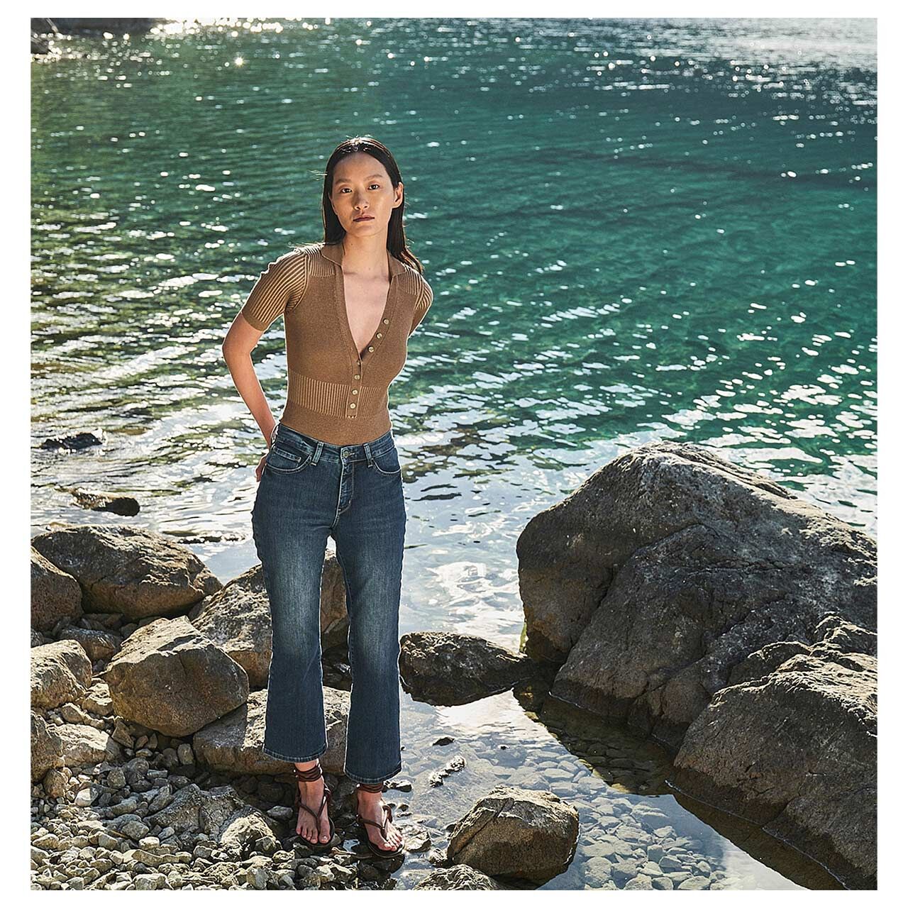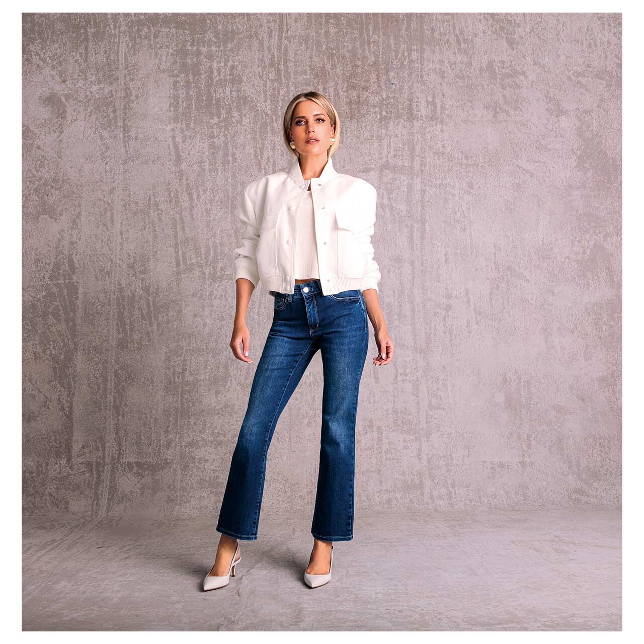 - Bootcut Fit: ausgestelltes Bein / hoher Bund