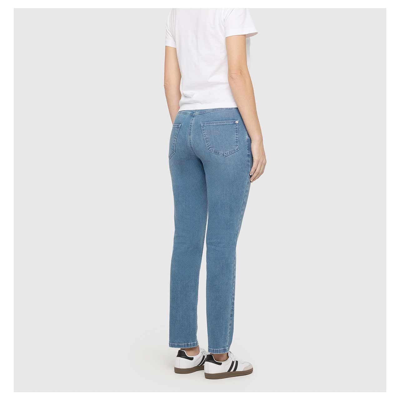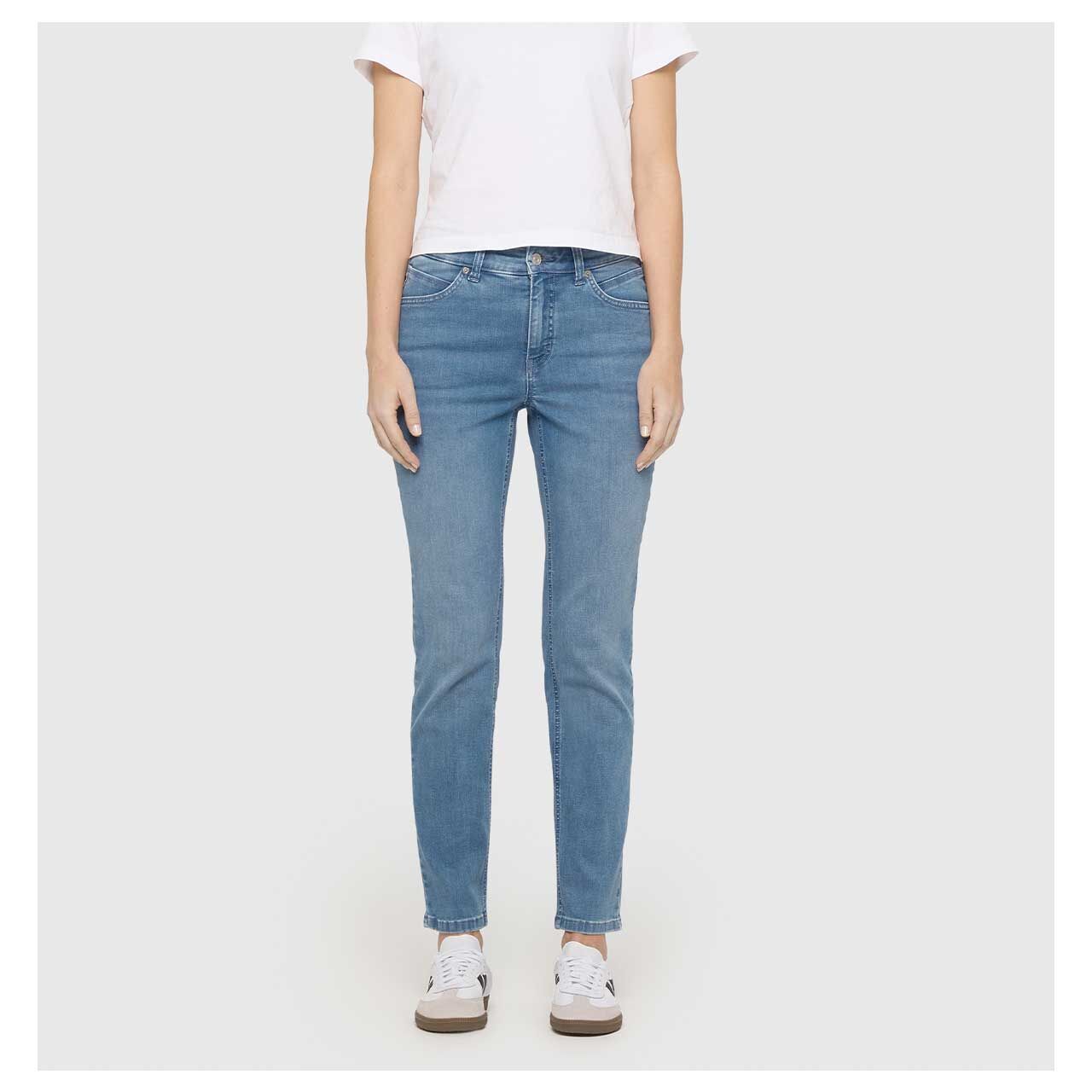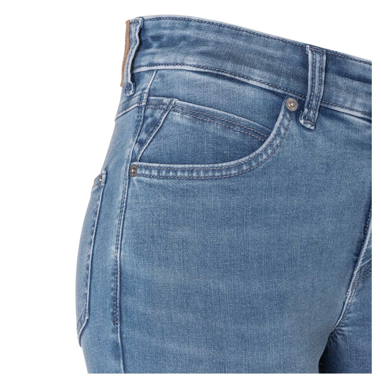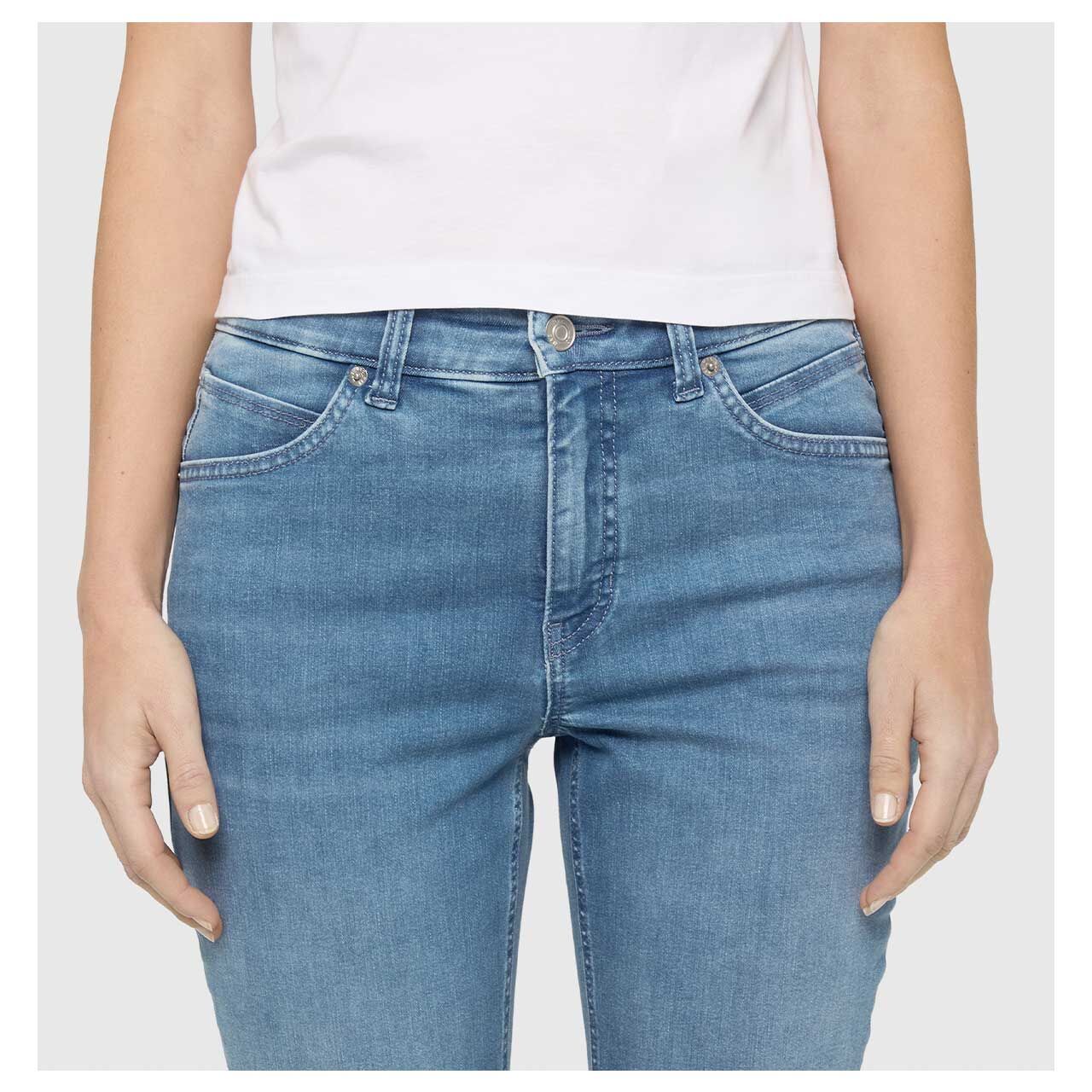 Die MAC Melanie präsentiert sich in einem hellen Blau, das sich nicht nur vielseitig kombinieren lässt, sondern auch mit den silbernen Details ein tolles Design kreiert. Gleichfarbige Nähte und dezente Sitzfalten runden den schlichten Look perfekt ab.