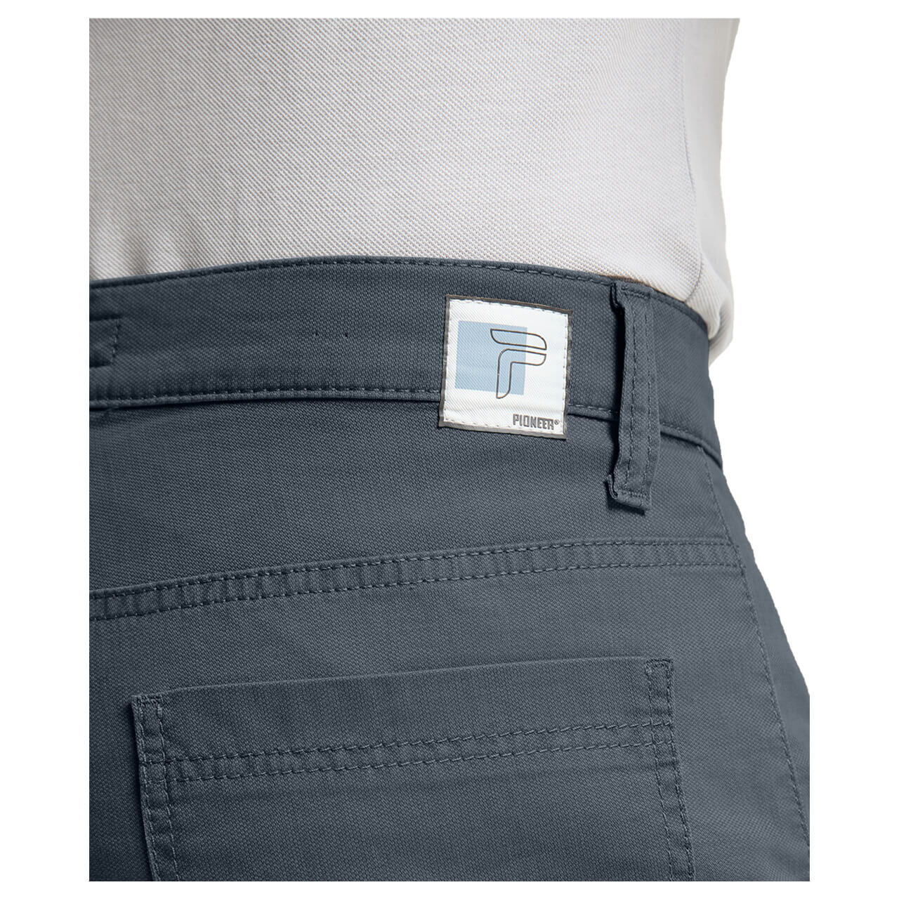 Zwei Beintaschen mit Klappe, zwei schräge Fronttaschen und zwei Gesäßtaschen: Die Pioneer Jeans Paul ist eine 3/4-Hose für den funktionalen Mann. Gleichfarbige Nähte und dunkelblaue Hosenknöpfe erzeugen ein ruhiges Bild bei der Herrenhose.