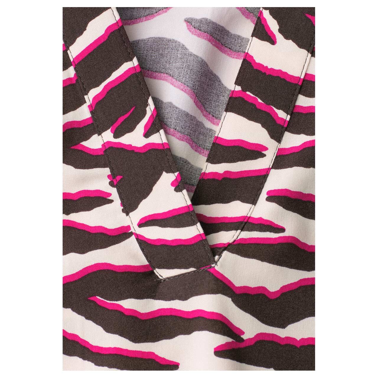 Diese gemusterte Damen Bluse von Street One setzt mit ihrem Zebra-Print modische Akzente. Die weiche Viskose fällt fließend und sorgt für ein angenehmes Tragegefühl. Split Neck und Kurzarm verleihen der Bluse eine leichte Ausstrahlung, während der leicht gerundete Saum für eine schmeichelnde Silhouette sorgt.