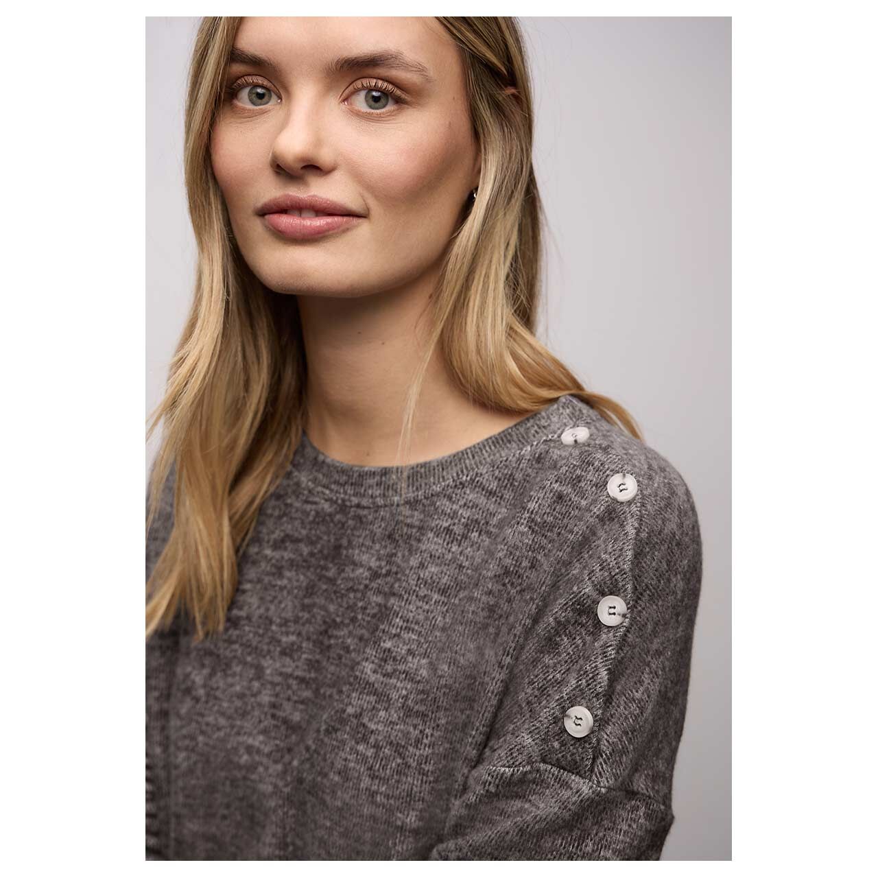 Ein vielseitiges Lieblingsstück für entspannte Outfits! Das Damen Langarm Shirt von Street One besticht durch seinen femininen Melange-Look und dezente Knopfdetails an den Schultern. Der Rundhalsausschnitt und seitliche Schlitze im Saum unterstreichen das legere Design. Die weiche Qualität trägt sich angenehm und passt perfekt in den Alltag.