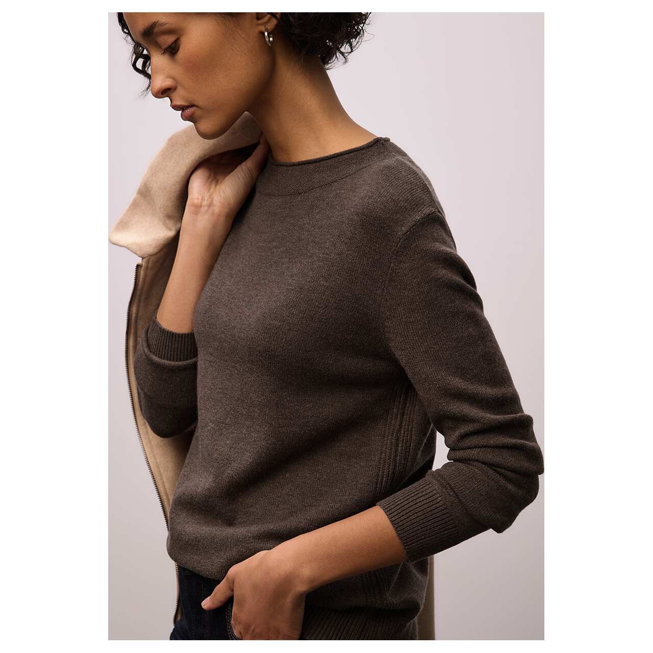 Damen Pullover Rolled Edge Collar in Dunkelbraun meliert