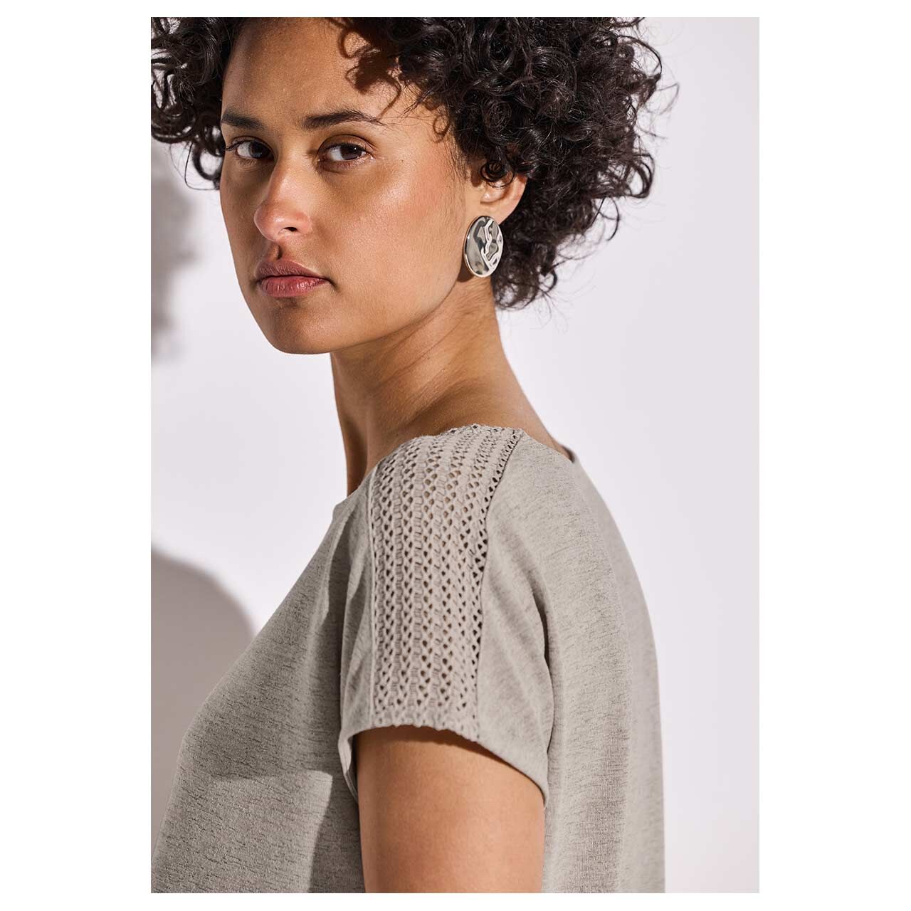 - Beschreibung Damen T-Shirt Linen Look with Laceshoulder in Beige meliert Das Damen T-Shirt von Street One begeistert mit Spitzendetails an den Schultern. Der luftige Materialmix mit Leinen-Optik sorgt für ho… Mehr
